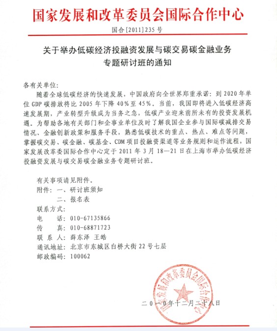 經(jīng)國家發(fā)改委國際合作中心授權(quán),現(xiàn)將國合【2011】235號文件關(guān)于2011年3月18日—21日在上海市舉辦“低碳經(jīng)濟投融資發(fā)展與碳交易碳金融業(yè)務(wù)專題研討班”通知轉(zhuǎn)發(fā)如下, 屆時將邀請國家發(fā)改委能源所、國務(wù)院發(fā)展研究中心、清華大學(xué)、財政部清潔發(fā)展機制基金管理中習(xí)等有關(guān)單位領(lǐng)導(dǎo)專家,現(xiàn)場授課交流,歡迎各會員單位報名參加。具體可與本站聯(lián)系方式中明確的郵件及電話聯(lián)系,也可直接與附件中會務(wù)組聯(lián)系。