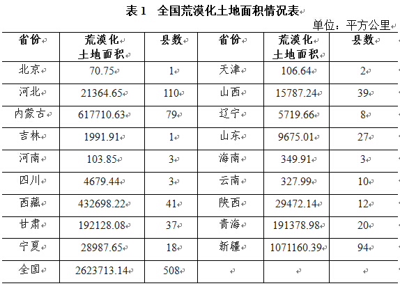 截至2009年底,全國荒漠化土地總面積262.37萬平方公里,占國土總面積的27.33%,分布于北京等18個省的508個縣(旗、區)。動態情況,2005-2009年五年間年均減少2491平方公里。